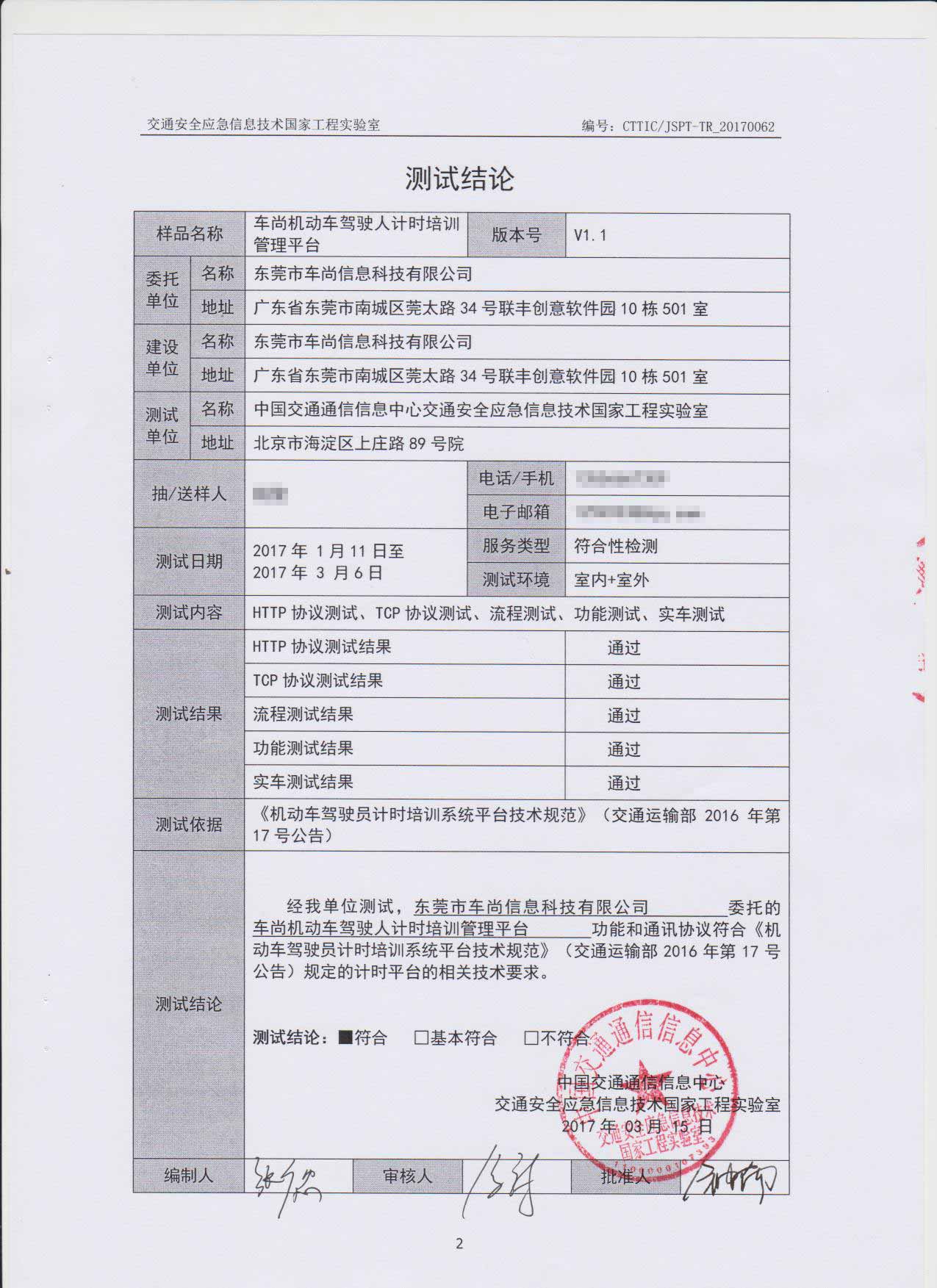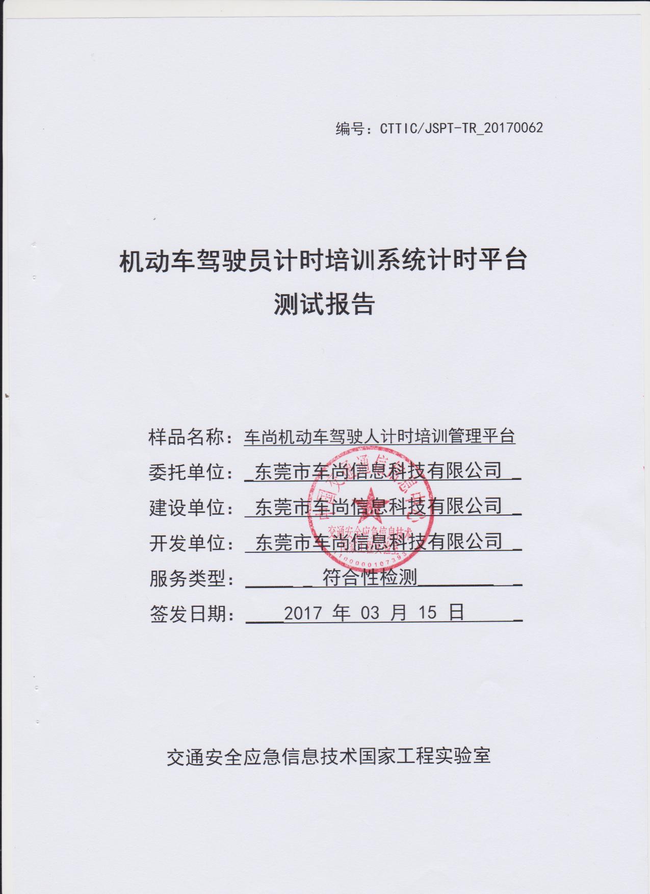 车尚机动车驾驶人培训管理平台于2017年3月15日顺利通过国家交通部等相关部门的测试检测,该平台响应政府政策指引,完全满足最新《机动车培训考试大纲》要求,符合 国家部委规范要求,该平台过检为本公司在驾培行业的业务开展提供有力支撑。